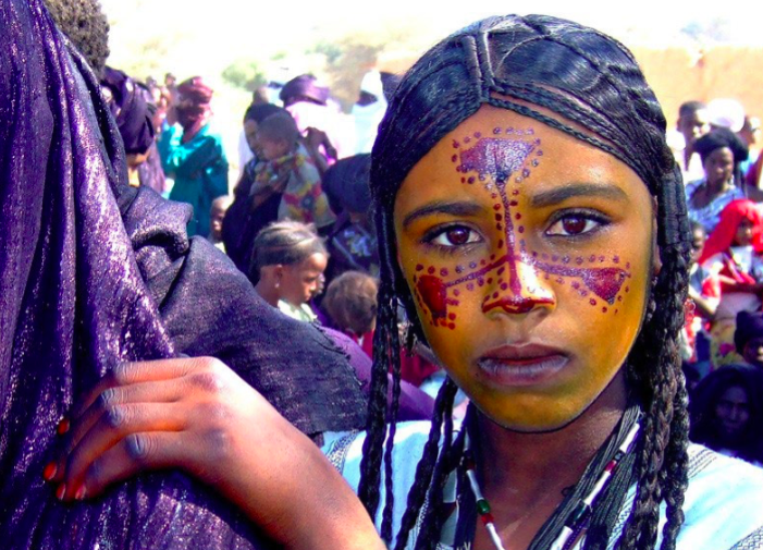 Venant de différents groupes touaregs du Sahara, ces jeunes femmes établissent un rituel beauté drastique, transmis de mère de fille, se parant de maquillages spectaculaires aux teintes ocre ou brun indigo.